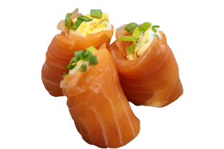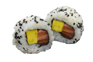 Arroz, alga, sésamo, aguacate, salmón, huevo y queso cremoso.