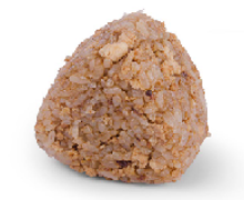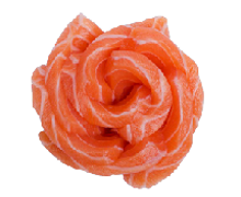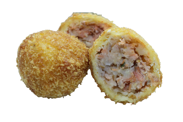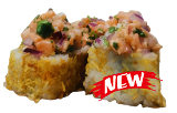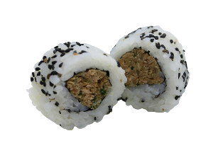 Arroz, alga, salmón cocinado, queso cremoso, verdeo, salsa picante y panko.