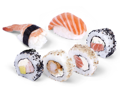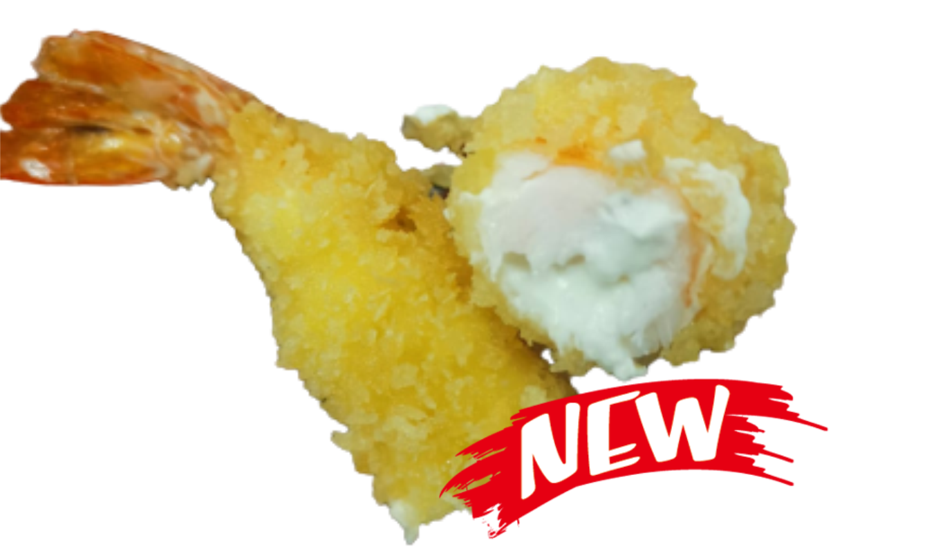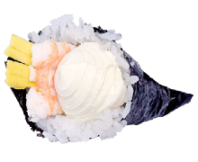 Arroz, alga, sésamo, tempura de langostino, huevo, salmón, verdeo y queso cremoso.