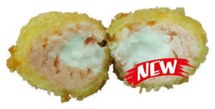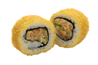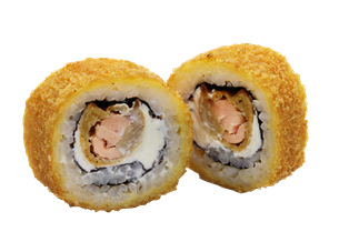 Salmon Frito, arroz, alga, queso cremoso y panko.