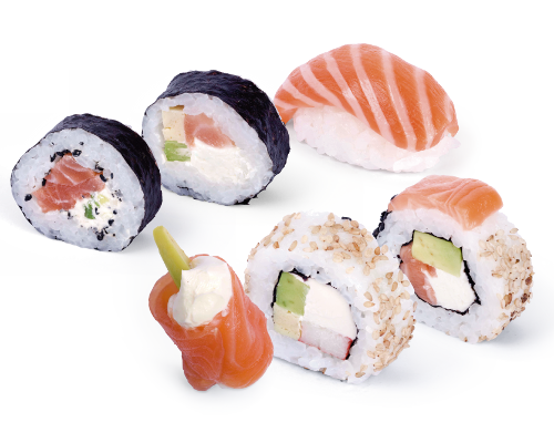 Arroz, alga, sésamo, aguacate, salmón, verdeo y queso cremoso.