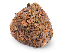 Arroz, salmón cocinado, verdeo, sésamos y salsa de soja.
