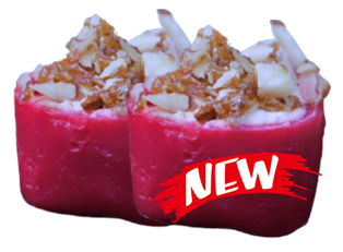 Tamago, camarón hervido, queso cremoso y almendras caramelizadas.