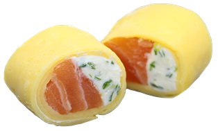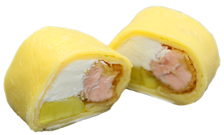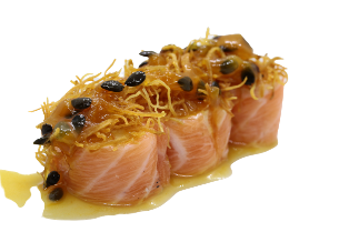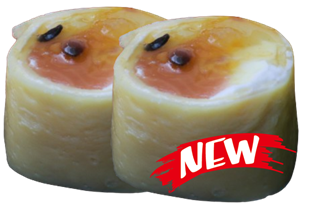 Tamago, salmón, palmito, queso cremoso y salsa de mburucuya.