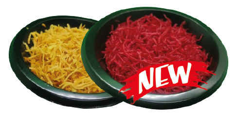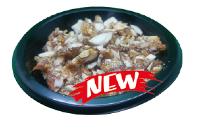 Alga, arroz, crocantes de batatas, salmón, camarón, cebolla morada, jugo de limón, cilantro y pepino.